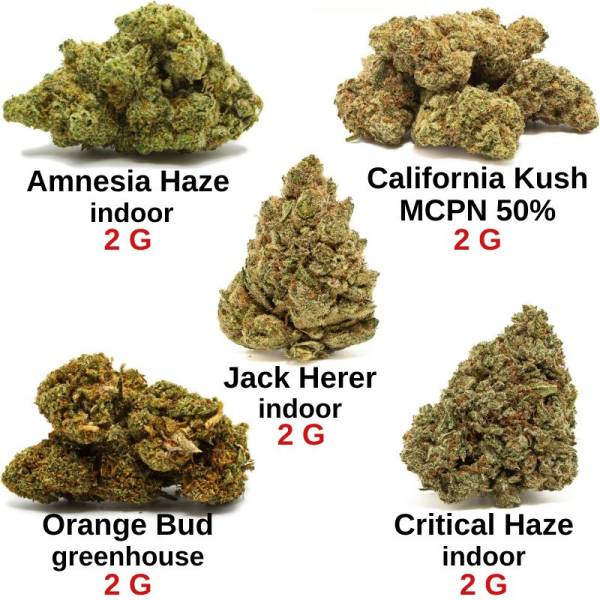 Vous découvrirez dans ce pack 10g « notre sélection » 5 fleurs de CBD de qualités remarquables. Des arômes très diverses s'offrent à vous avec l’Amnesia Haze, la Jack Herer, la California Kush MCPN 50%, la Orange Bud et la Critical Haze. Celles-ci sont cultivées en indoor ou greenhouse, sans produits chimiques nocifs à la santé et à l’environnement. Elles contiennent toutes un taux inférieur à 0,3 % de THC.